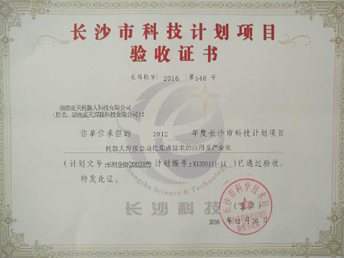 長沙市科技計(jì)劃項(xiàng)目驗(yàn)收證書